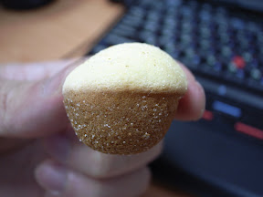 按照慣例今天早上送我女友去做火車,一樣買了三顆韭菜大煎餃,手上便有兩份早餐,比上次少一份,為了不讓上次三份早餐的慘劇再度發生,我到了公司把MUJI 無印良品的豆乳鈴型蛋糕放在包包內。可是腦中還是惦記這味道如何,最後忍不住還是打開來吃了。