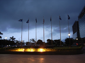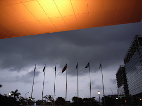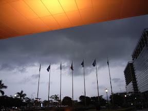 昨天早上原本晴朗的好天氣,到了下午,天色變暗,也狂風大作,下班在大廳等車時,覺得這天色奇特,就隨手拿起GR Digital拍了幾張,前兩張大廳上方燈的暖色,與前方俊冷的顏色形成強烈的對比。